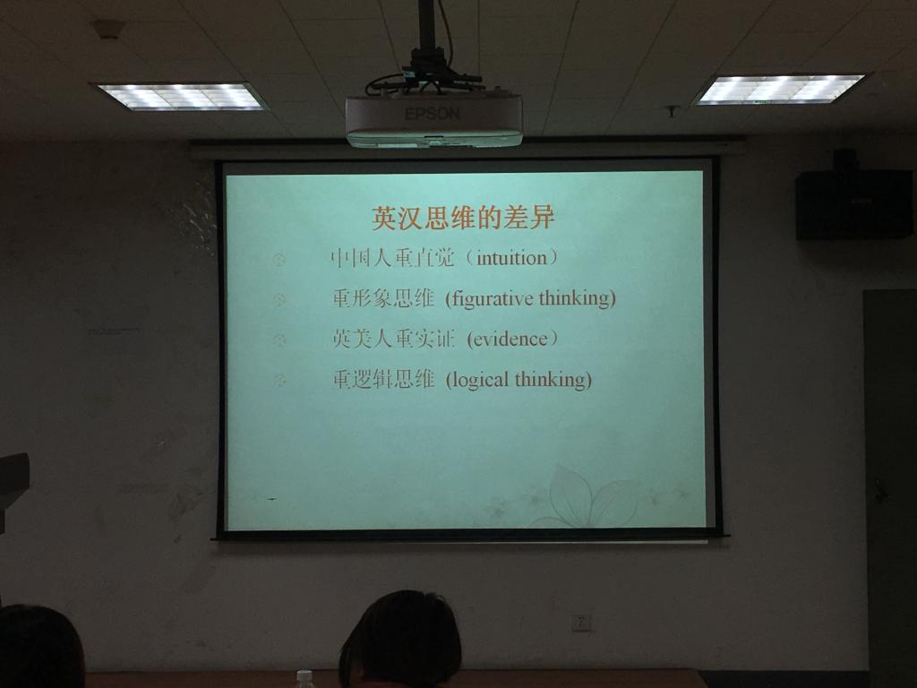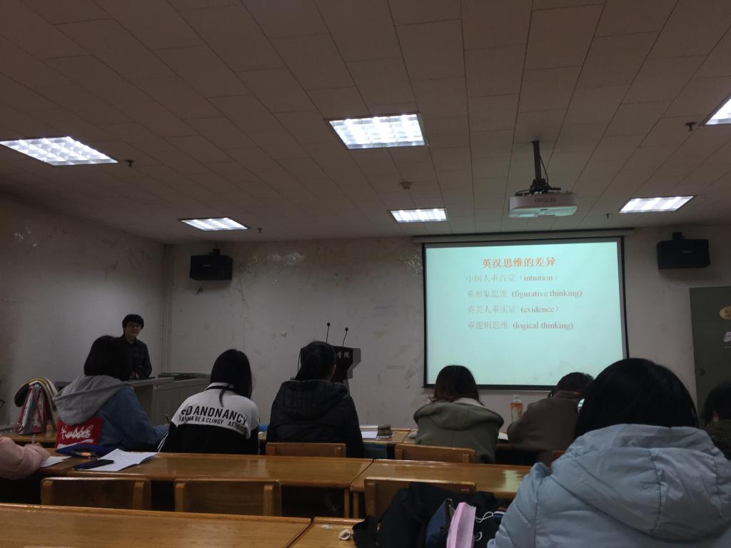 讲座一开始,李晶老师就英汉思维差异这一现象归纳出几条原因。接下来,通过提出问题引发同学思考,进一步解决问题推动讲座进行。“如何使抽象的意义具体化?”,通过提出这一问题来佐证虚实转换的重要性,之后提出了抽象概念具体化和具体概念抽象化两种解决方法,并举了大量的例子来帮助同学们理解。总之,李晶老师详细解决了同学们在英汉翻译中易出现的各类问题。