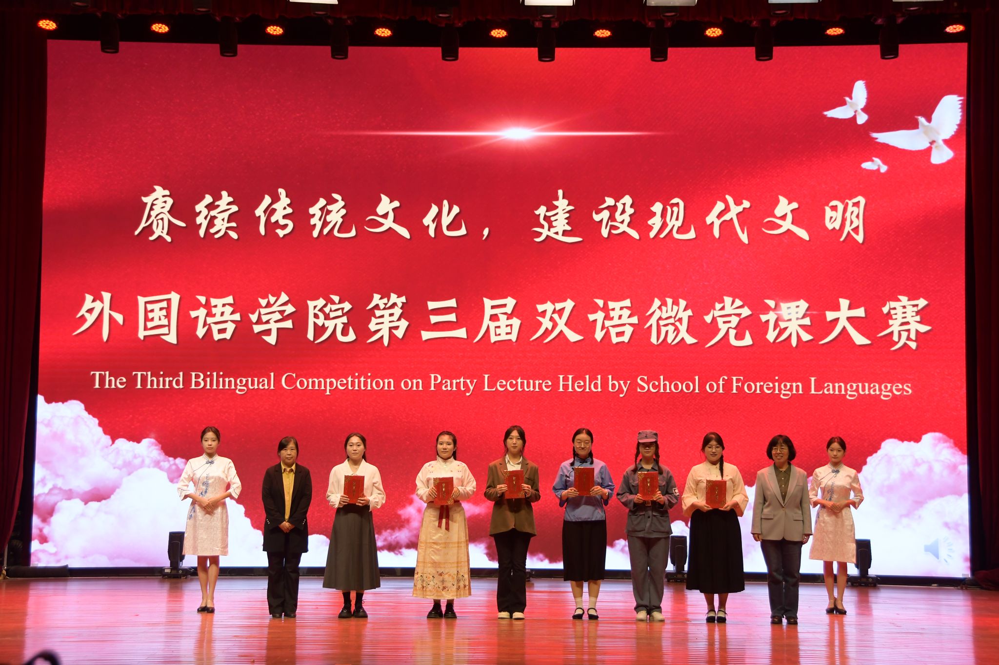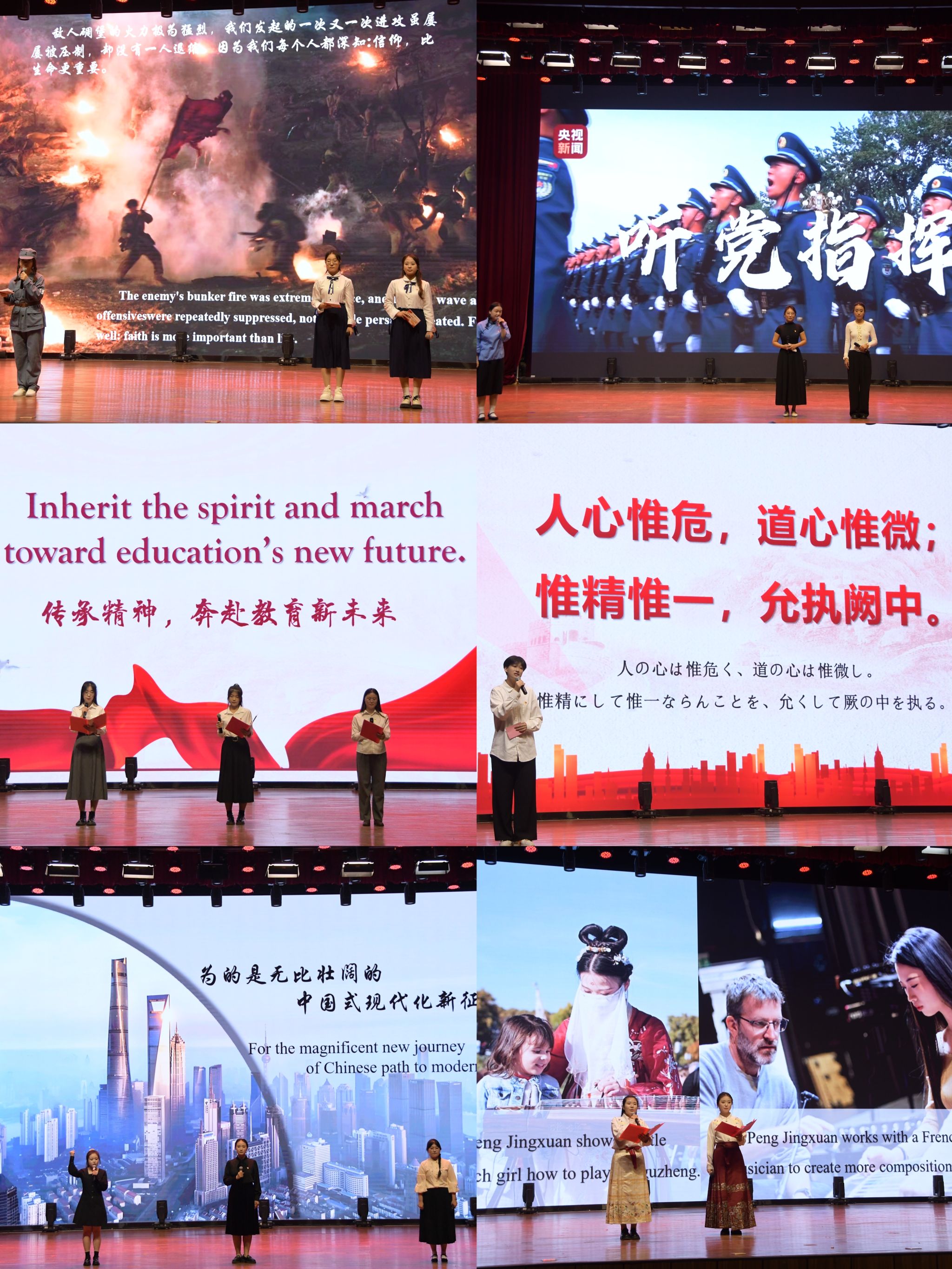 本次大赛把党的创新理论与专业知识结合起来,以双语微党课为平台,奏响青春使命的接力号角。节目展示借一封寄往八十年前的家书追忆革命峥嵘,在泛黄信笺的字句间,让先辈们崇高的家国情怀浸润人心;追溯百团大战的烽火岁月,从军队铸魂的“昔光”中汲取力量,引领青年学子传承初心使命,迈向逐梦“新途”;站在历史新起点,于“理想与信念”的滋养下积蓄力量,在“我们为何而奋斗”的叩问中笃定前进方向;以“中国核潜艇之父”彭士禄院士坚守岗位践行敬业奉献为榜样,引导青年学子于笃行中显初心,于细微处见担当,在平凡中创造不凡;着眼现实议题,用自身基层支教经历深刻诠释“教育家精神”的真谛,鼓励师范生做时代新人学习知识的引路人;深耕五千年文化沃土,展现青年一代在赓续文脉、传递文明薪火中的生动实践,彰显守护文化根脉的赤子之心。