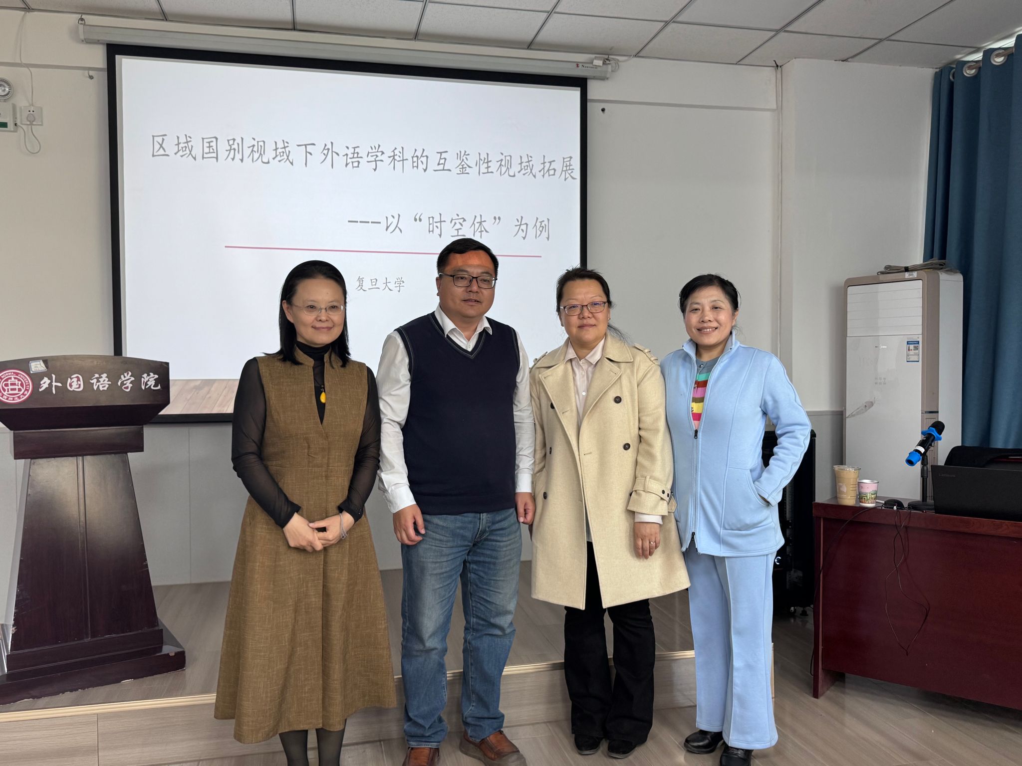 2026年4月10日下午,永利官网特邀复旦大学外文学院陈靓教授作题为“区域国别视域下外语学科的互鉴性视域拓展——以‘时空体’为例”的学术讲座。讲座由李楠院长主持,部分教师与研究生参加。